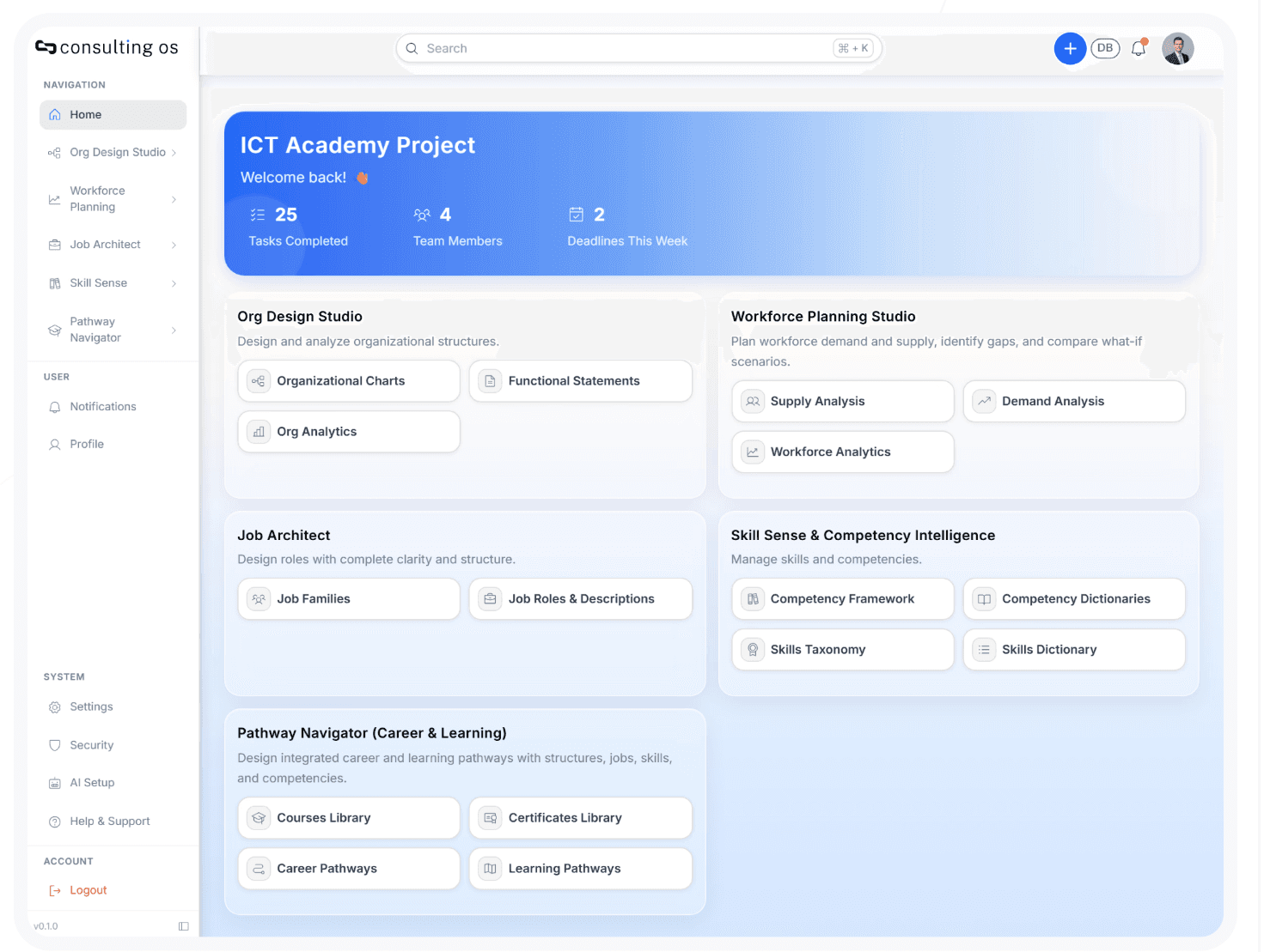 Unlike HR systems designed for day-to-day employee administration, Talent Cortex is built specifically for design-based work. This focus makes it easier to support complex transformations and strategic advisory engagements.